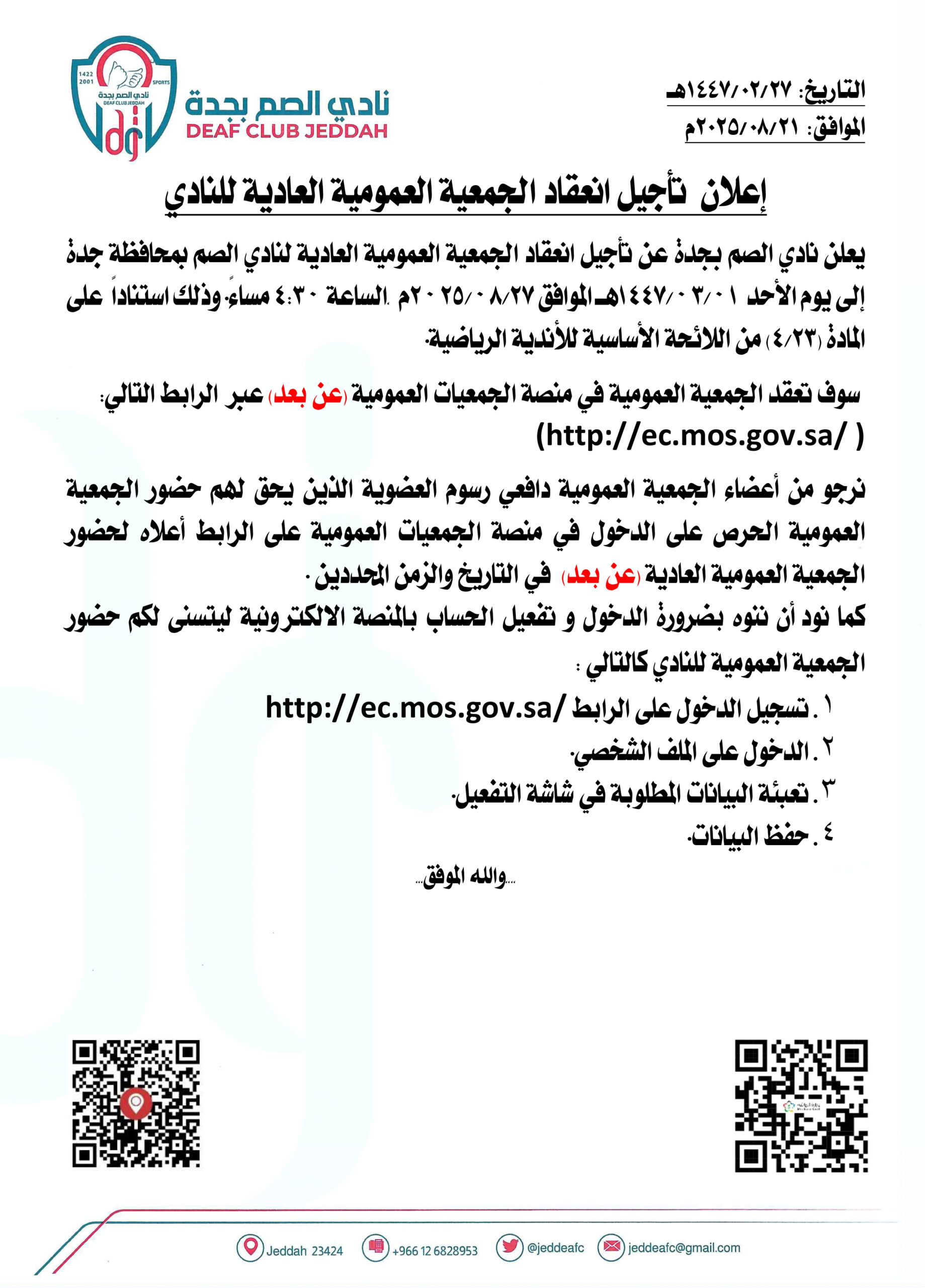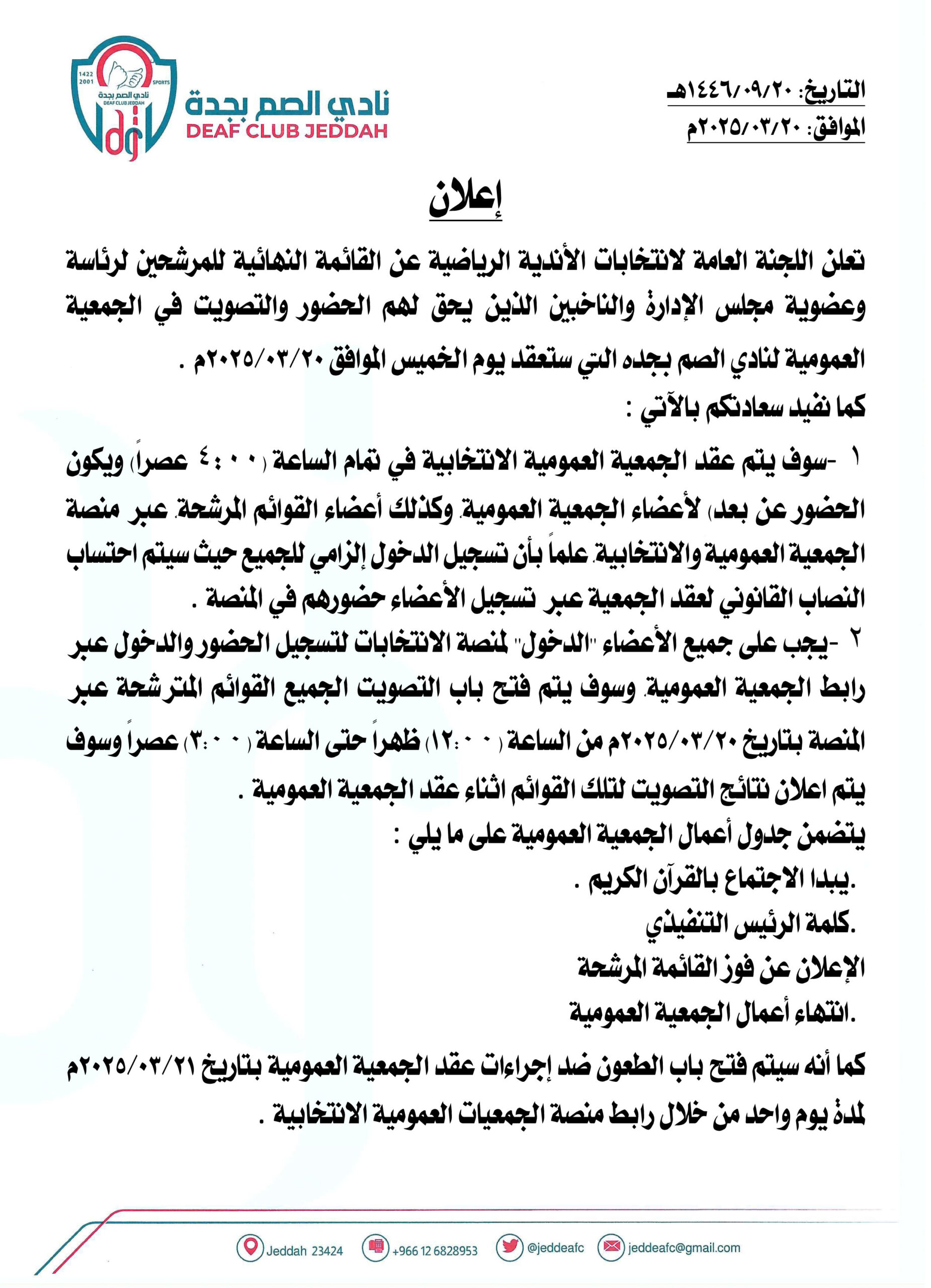 إعلان انعقاد الجمعية العمومية العادية لنادي الصم بجدة