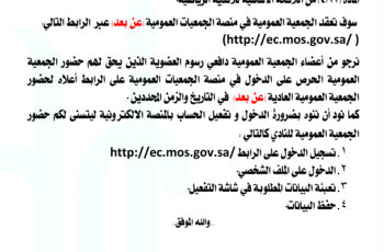 نرجو من أعضاء الجمعية العمومية دافعي رسوم العضوية الذين يحق لهم حضور الجمعية العمومية الحرص على الدخول في منصة الجمعيات العمومية على الرابط أعلاه لحضور الجمعية العمومية العادية (عن بعد) في التاريخ والزمن المحددين .