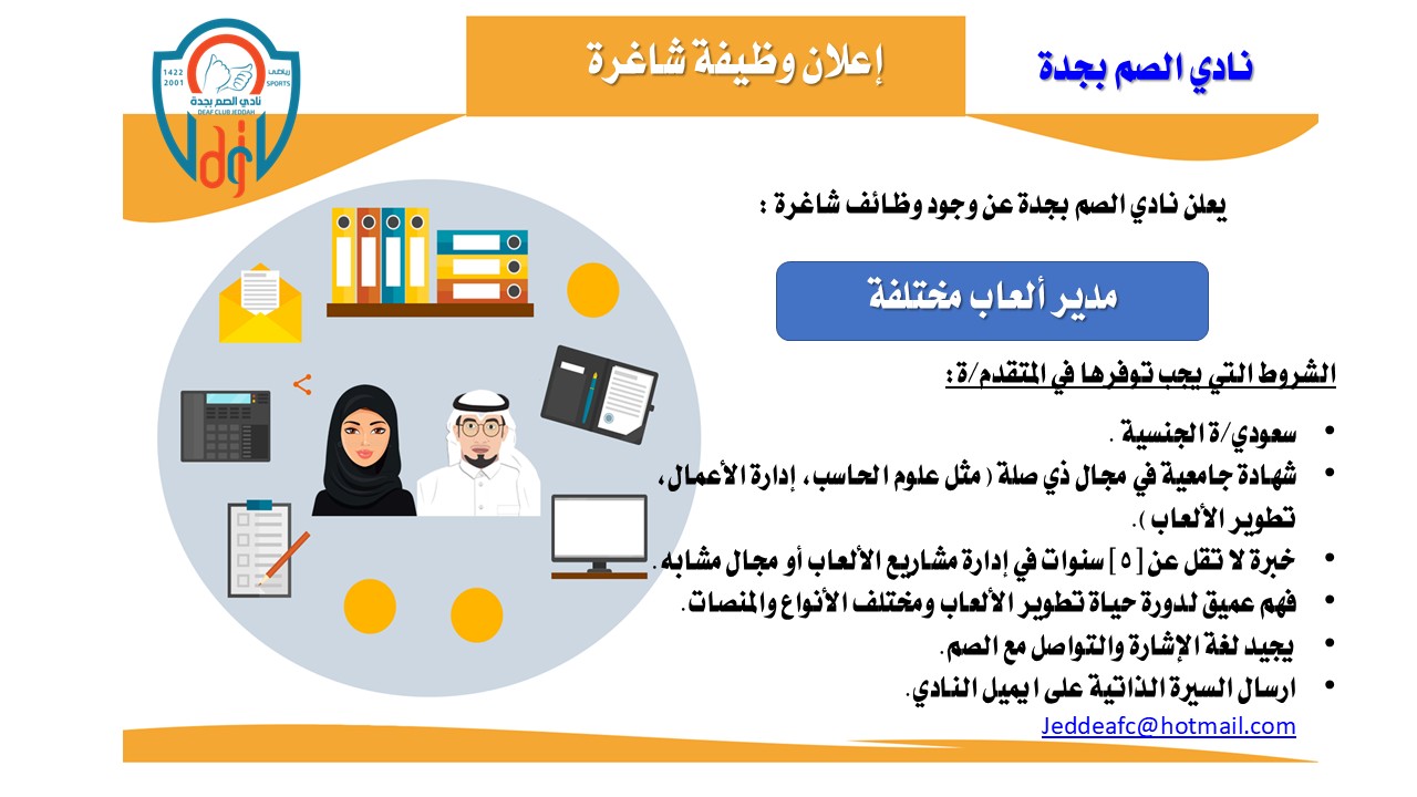 يعلن نادي الصم بجدة عن وجود وظائف شاغرة :